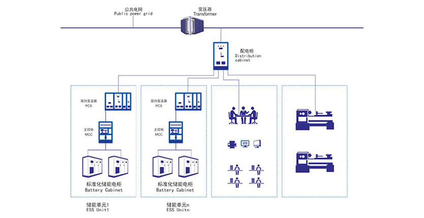我司MW級儲能系統采用先進(jìn)鋰離子電池(高能量密度、大充放電倍率、寬溫度范圍、長(cháng)循環(huán)壽命)、高效率能量變換器(PCS)、智慧能量管理系統(EMS)作為核心部件;通過(guò)高精度傳感器對負荷進(jìn)行實(shí)時(shí)監測,采用功率實(shí)時(shí)補償與最優(yōu)節能用電綜合策略控制算法,實(shí)現商業(yè)儲能系統與原有配電系統無(wú)縫融合,給用戶(hù)帶來(lái)獨特商業(yè)價(jià)值。